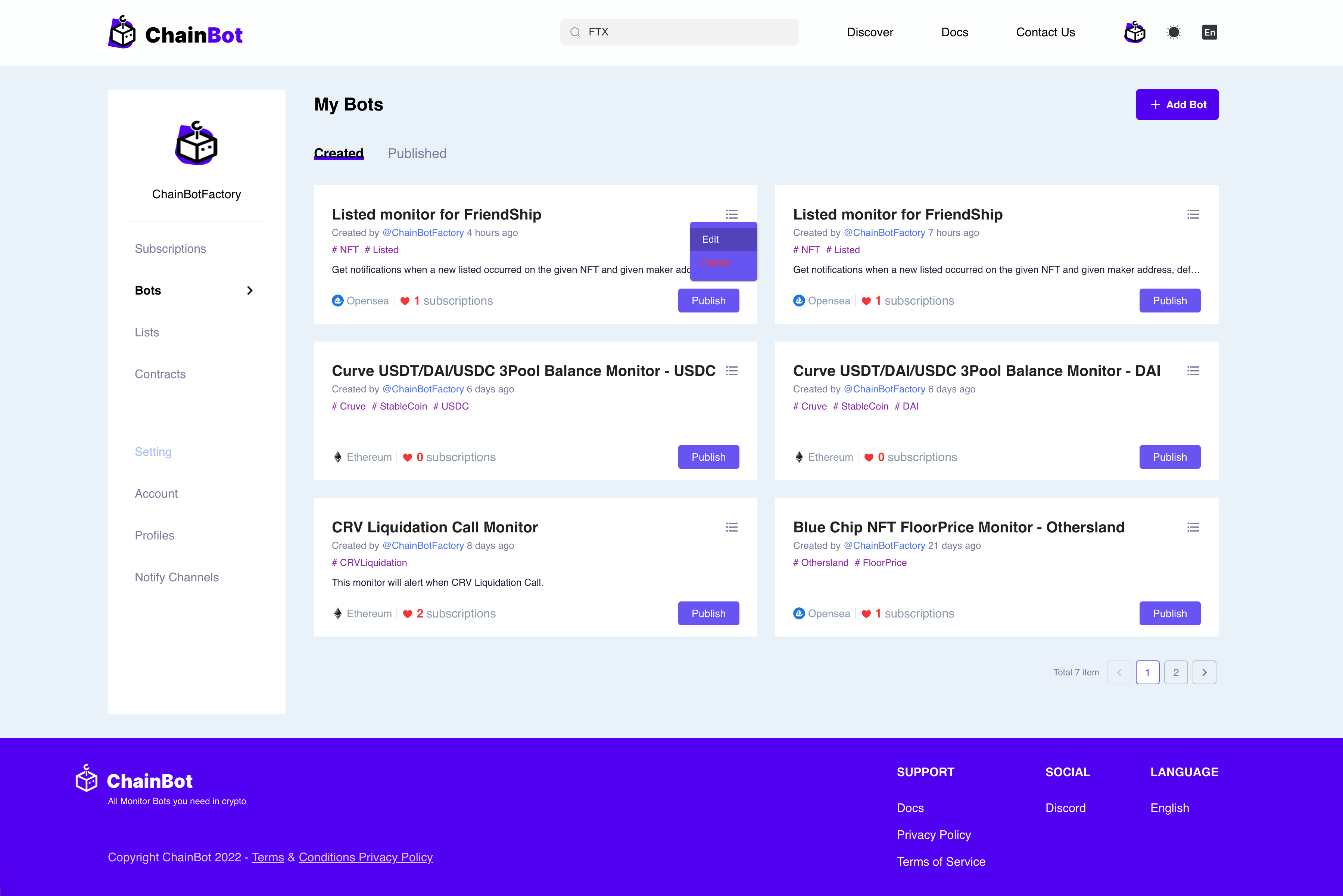 After logging into the ChainBot platform, navigate to the "Bots" section on your personal page, select the target Bot you wish to operate, click the button on the upper right corner of the Bot, and then click "Delete" to delete the current Bot.