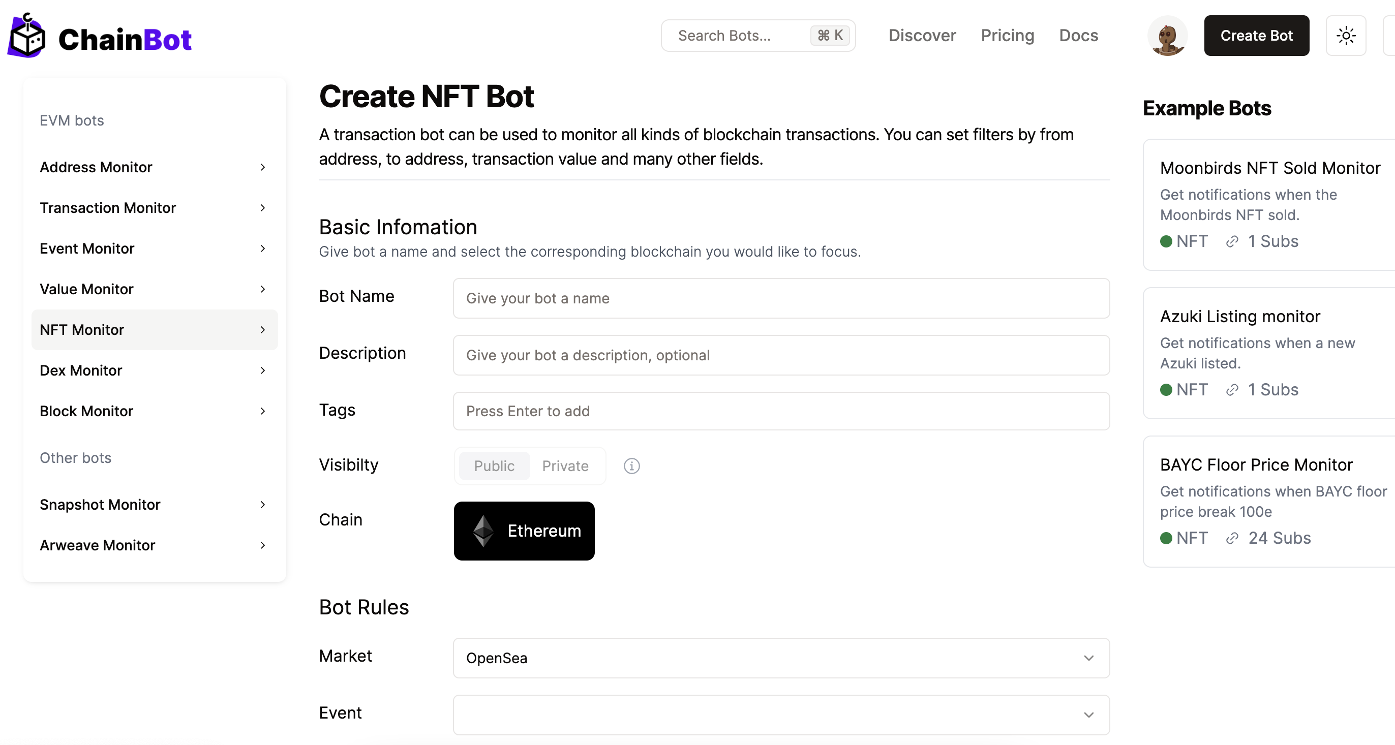 After logging into the ChainBot platform, go to the upper right corner and click "Create Bot" -> "NFT Monitor".