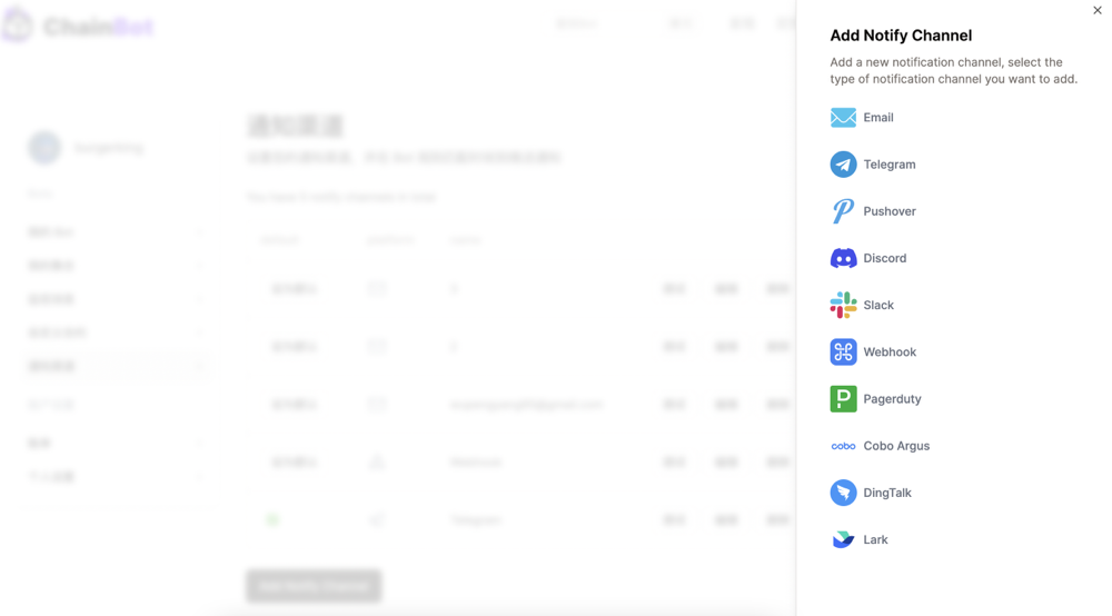 ChainBot supports user configuration for instant messaging apps like Slack, Discord, Telegram, and Dingtalk. It also supports professional notification products such as Pushover and Pagerduty, as well as custom Webhook pushes defined by users.