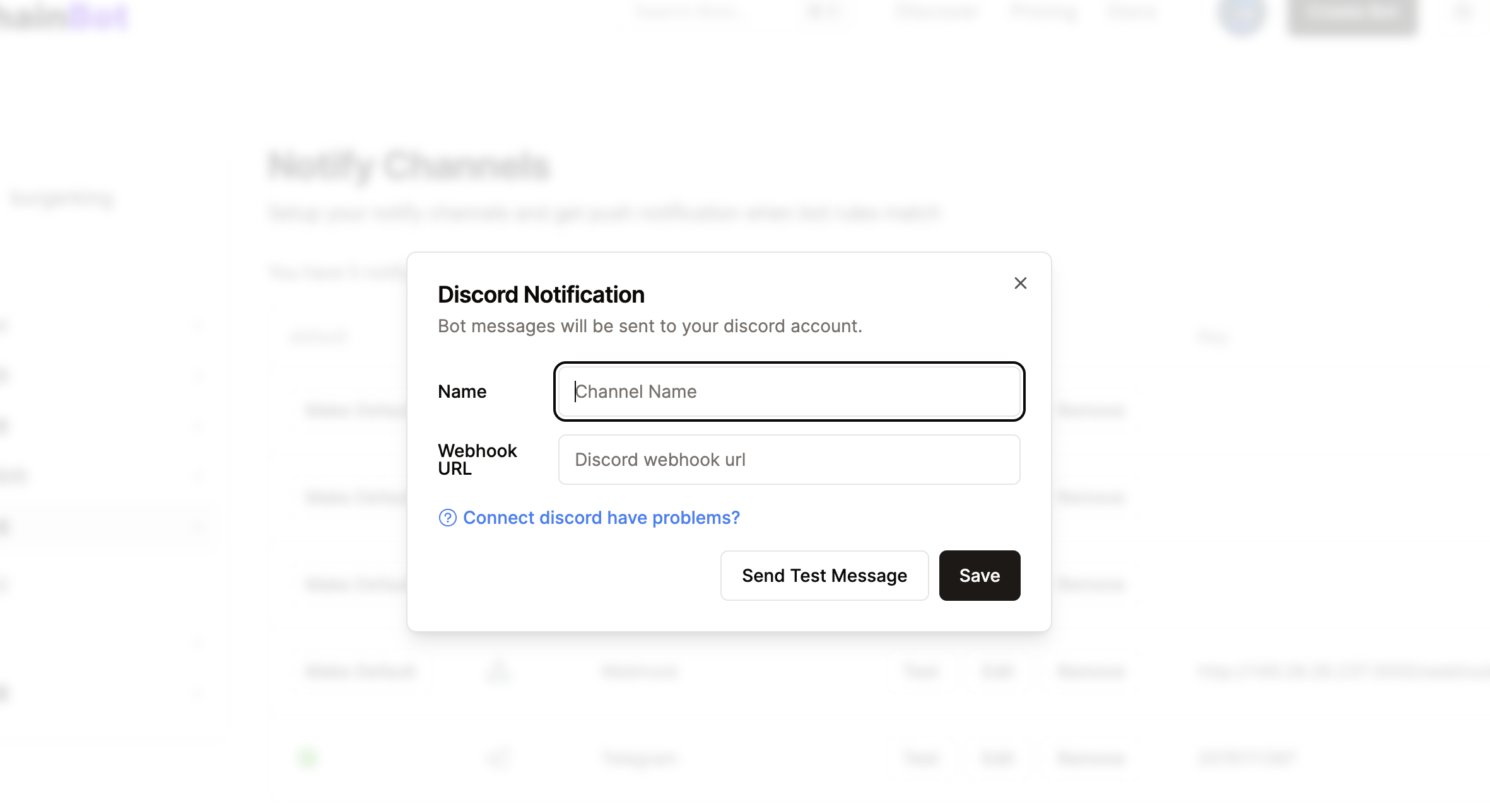 2. Copy the Webhook link to the ChainBot platform and fill in the name of the Webhook.