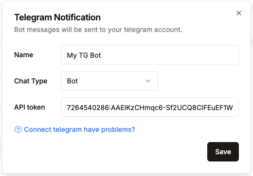 Copy the API Token, return to ChainBot, choose "Bot" as Chat Type, and paste the API Token in the corresponding input box. Click Save.