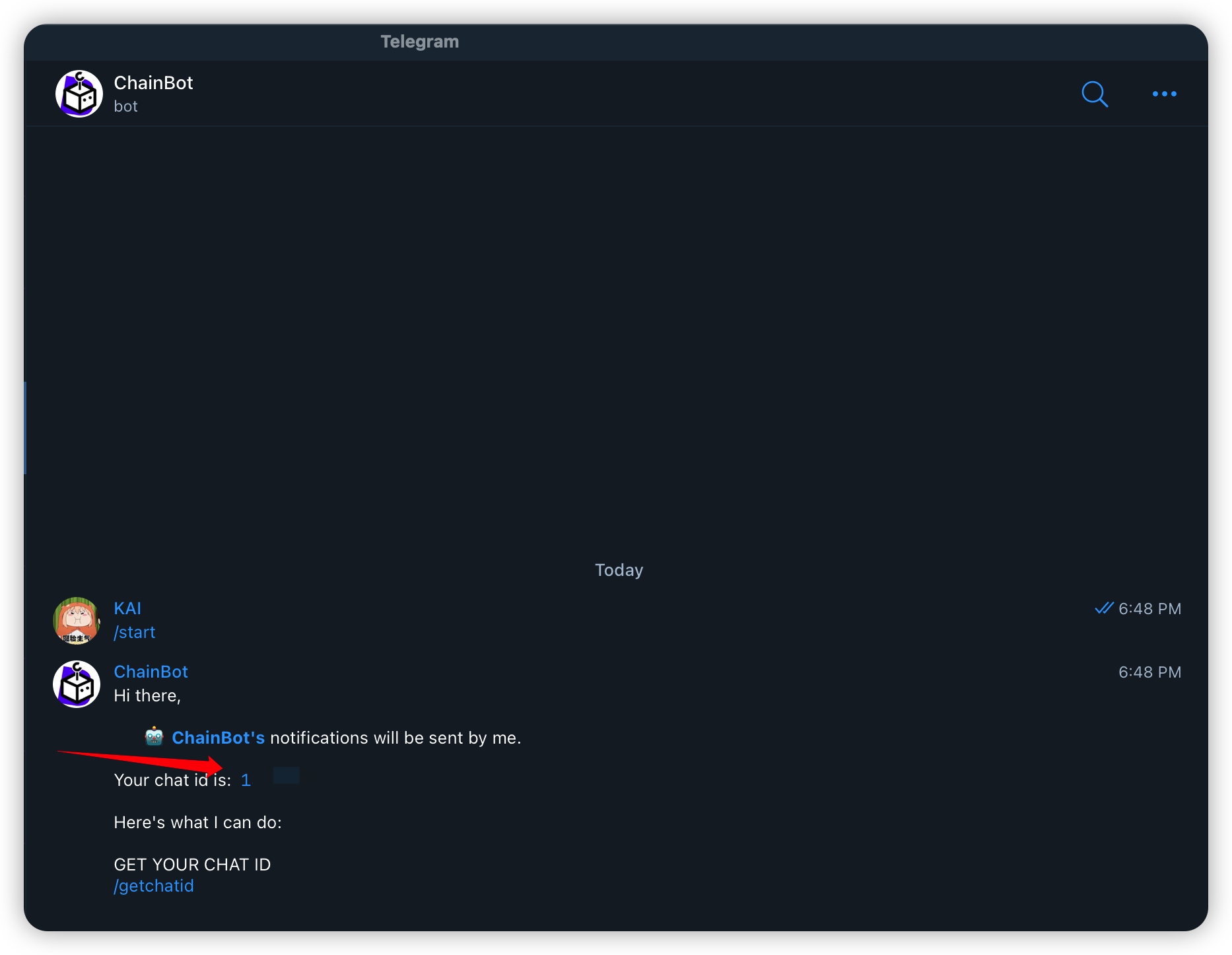 After choosing "Start," you will receive a message from ChainBot that includes the Chat ID.