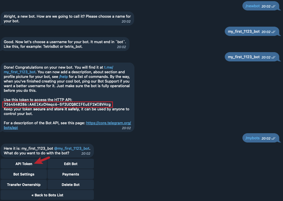 After creating your own Bot using BotFather, you will see the API Token for this Bot. Or, you can choose the recently created Bot again from the /mybots menu command to view this API Token.