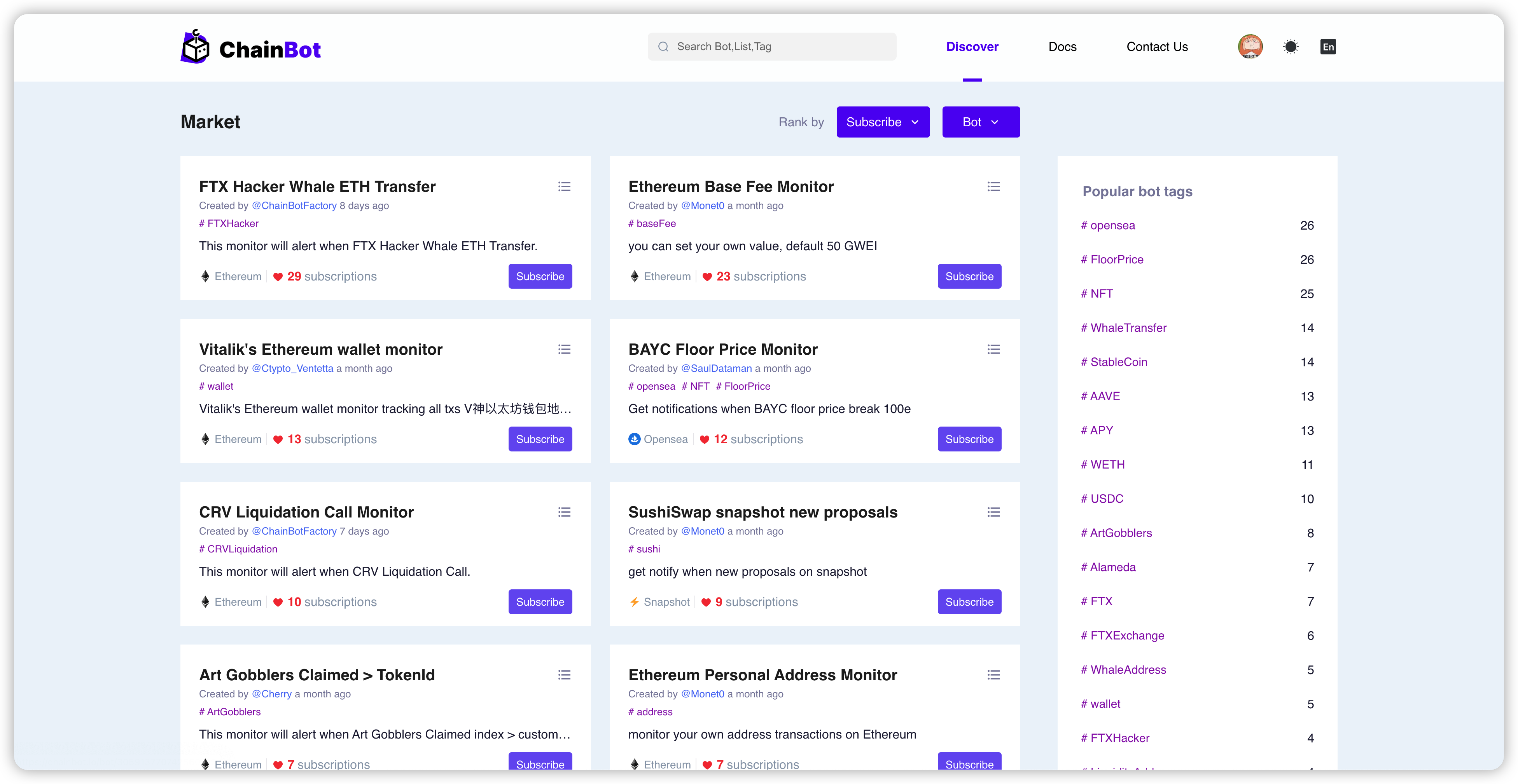 7. [After creating the Bot monitoring, subscribe to the notifications for that Bot](https://docs.chainbot.io/basic-usage/subs)
