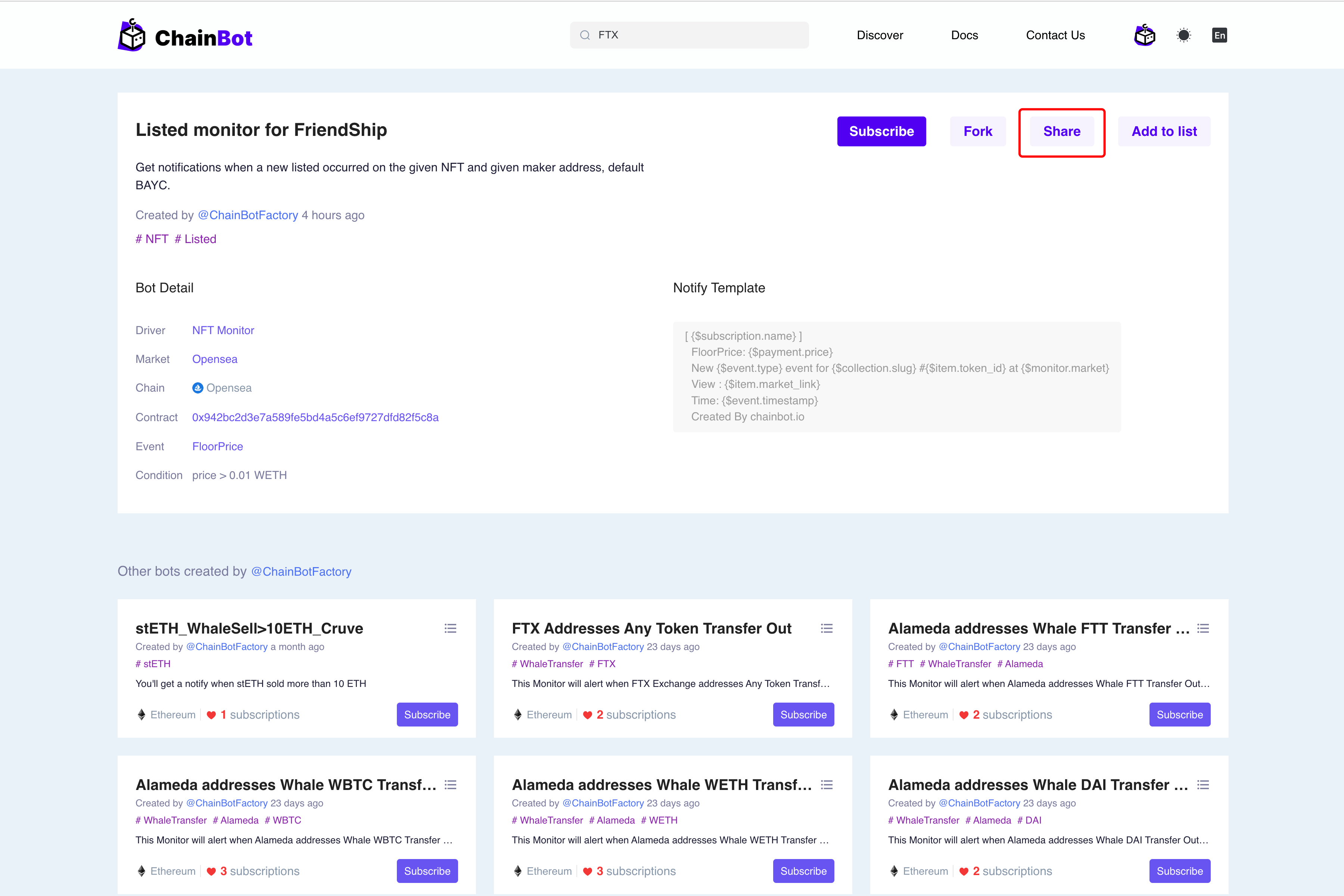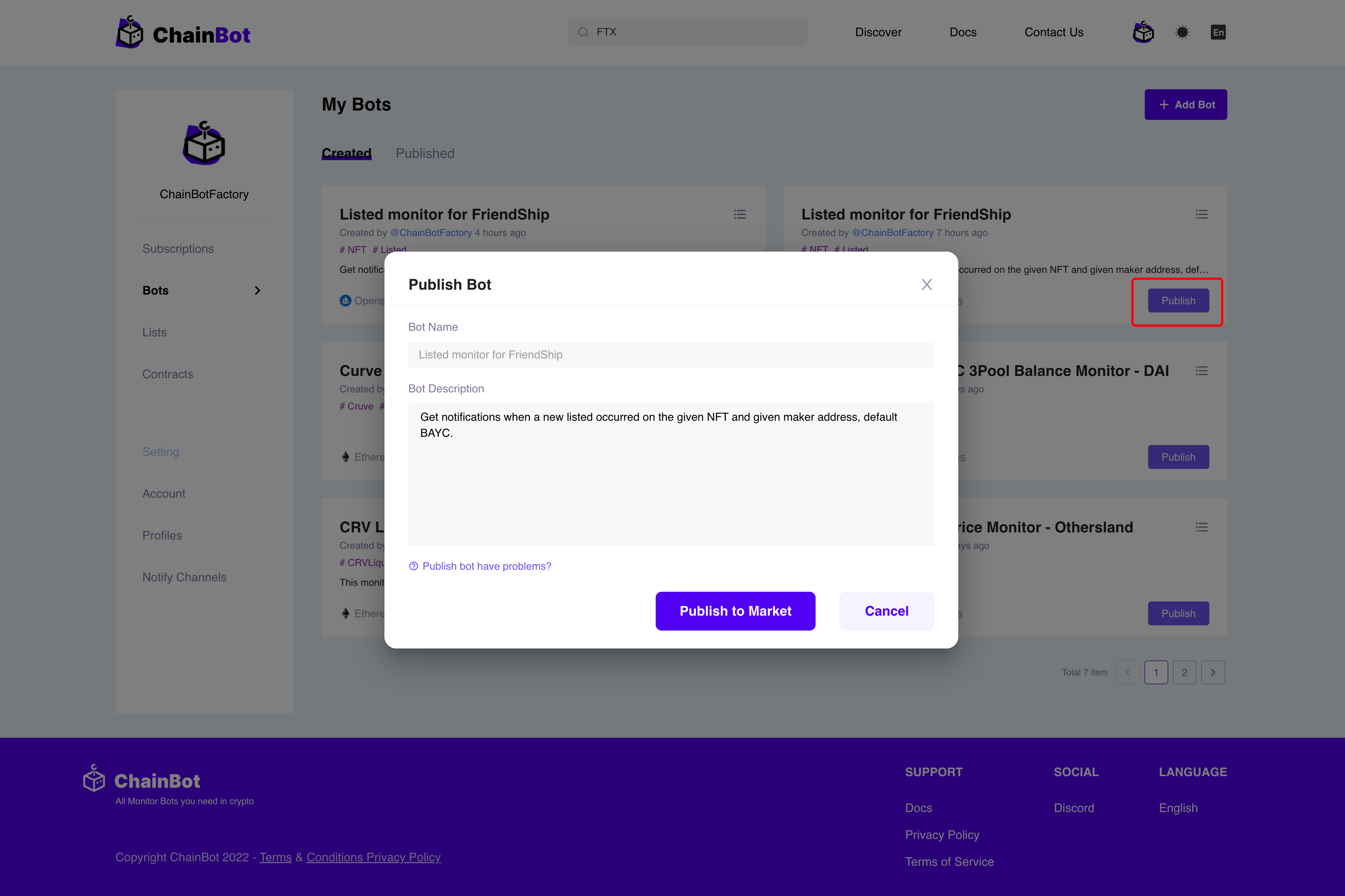 默认情况下，在 ChainBot 平台创建的 Bot 为私有 Bot，即其他人无法看到你创建的 Bot，如果需要分享当前 Bot，则需要将该 Bot Publish 出去，Publish 成功之后，其他人则也可以通过搜索，或者 Discover 搜索并订阅你创建的 Bot；并且你可以在 “Bots” -> "Published" 中查看你已经 Published 的 Bot。