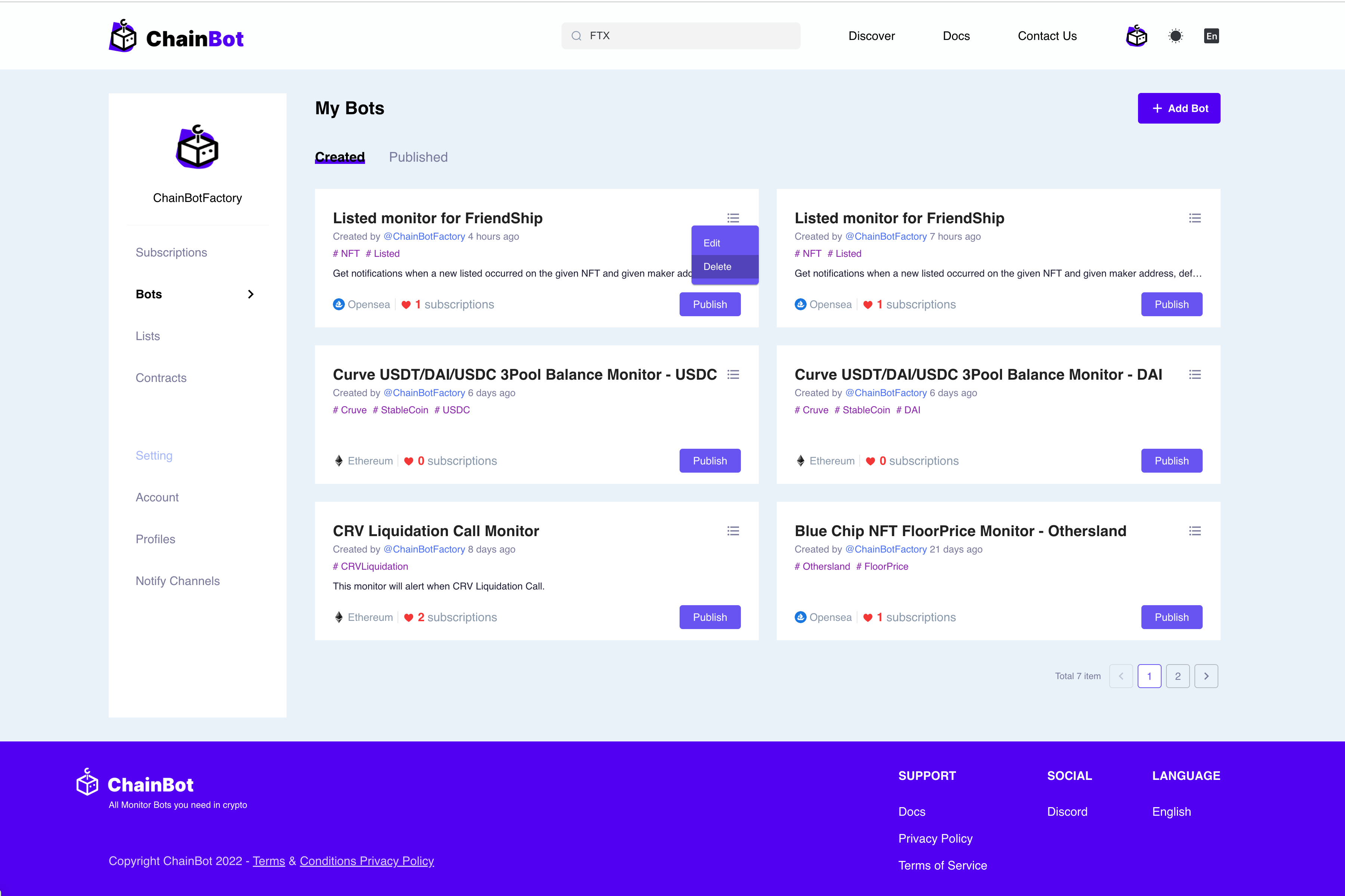 登录 ChainBot 平台后，个人页面选择 "Bots" 选择要操作的目标 Bot，点击 Bot 右上角的按钮，并点击 “Delete” 即可重新编辑当前 Bot。