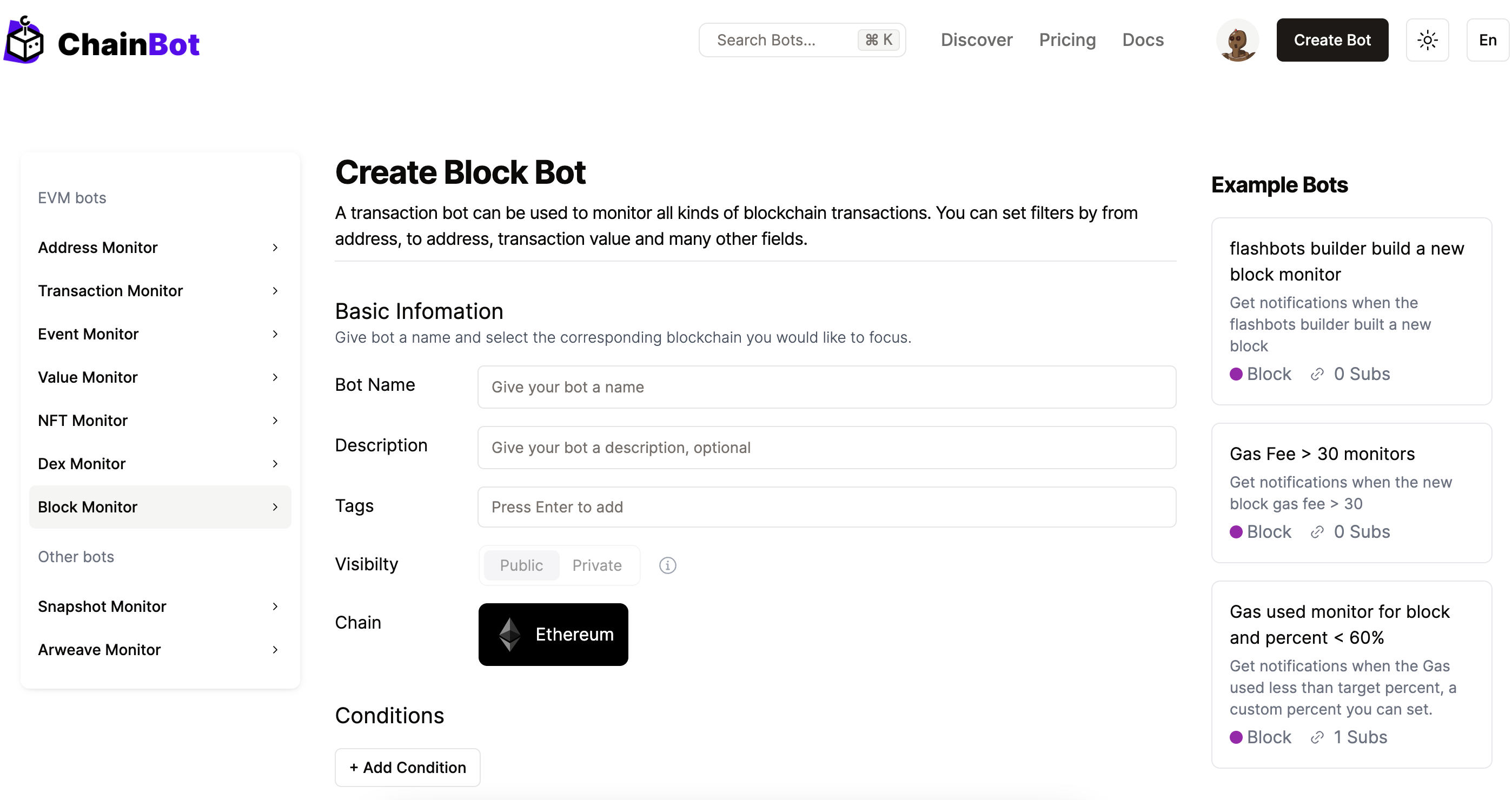 登录 ChainBot 平台后，右上角 "Create Bot" -> "Block Monitor"。