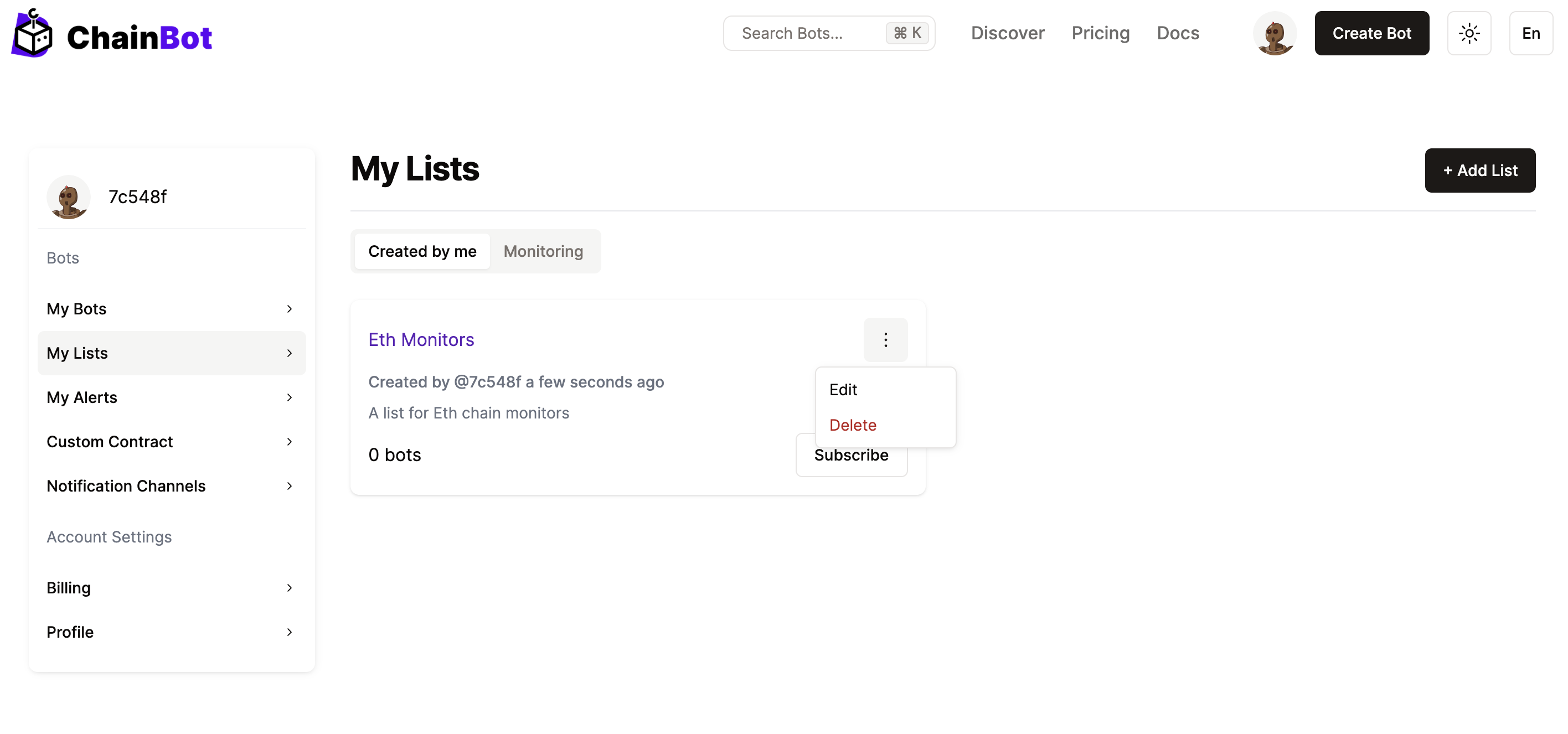 登录 ChainBot 平台后，个人页面选择 "My Lists"，选择特定的 Card，点击 “Subscribe” 按钮，即可订阅该 List 下的所有内容。