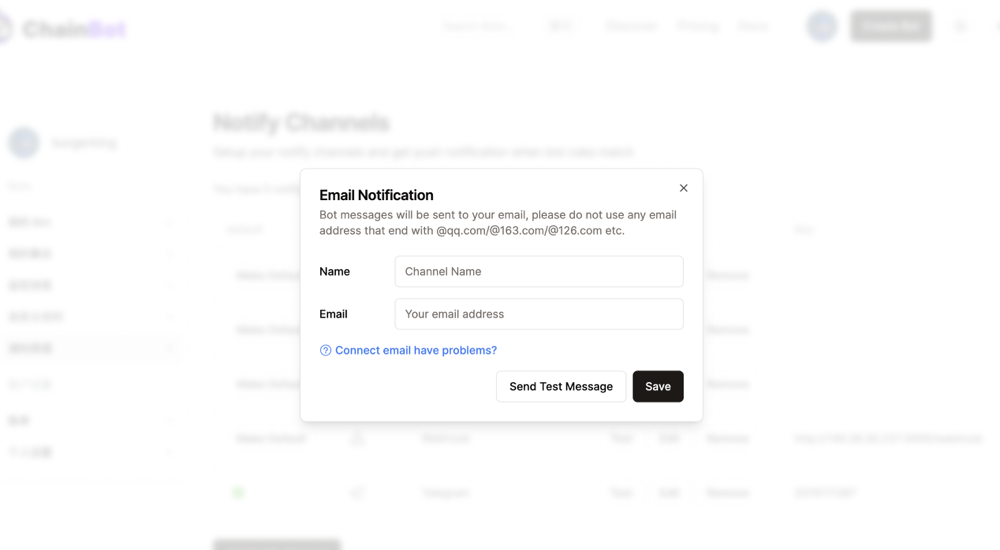 在 ChainBot 平台填写Email地址，以及名称。