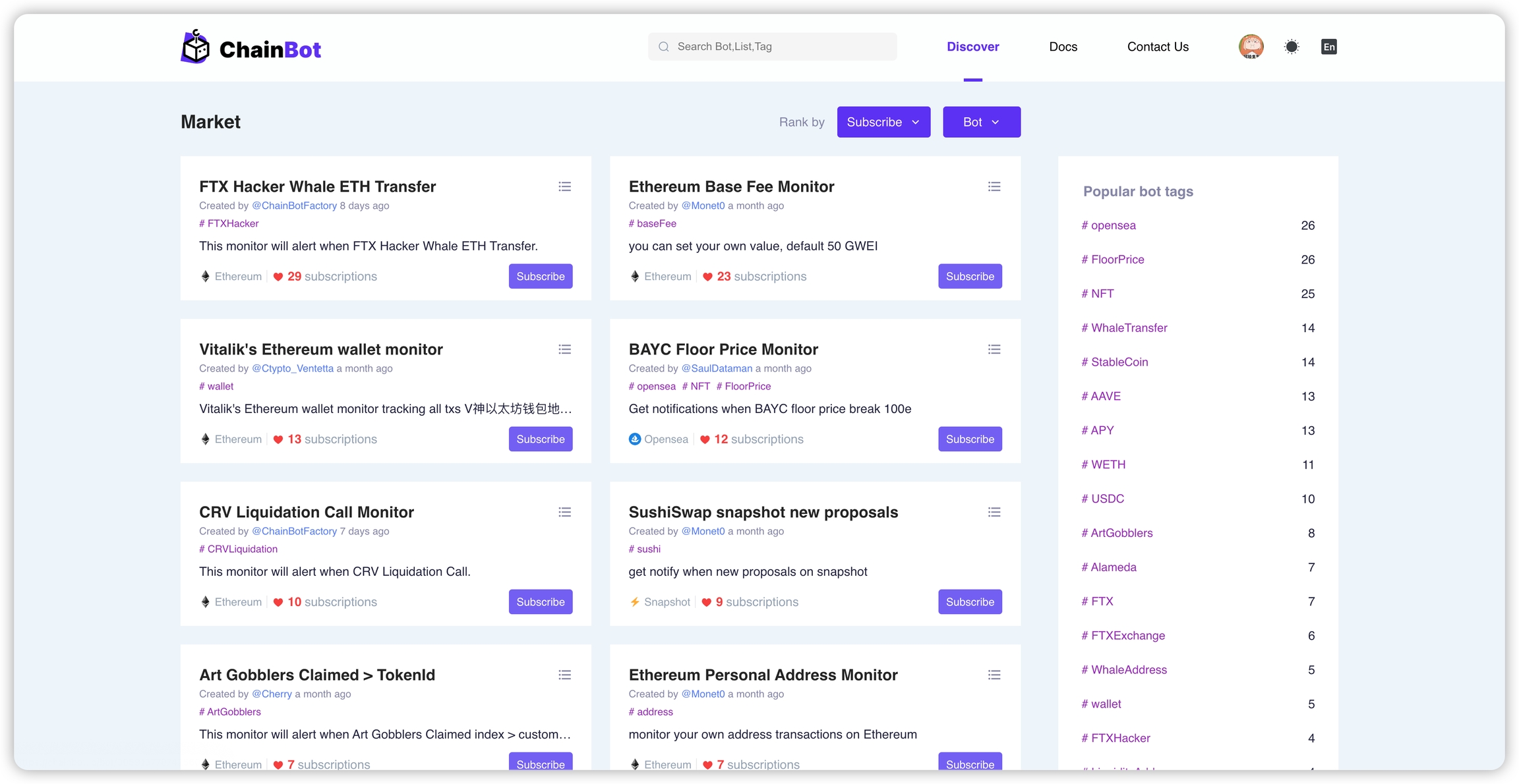 您可以通过平台的 Discover 页面或者通过顶部的搜索功能找到目标 Bot,如果尚未存在满足需求的 Bot 则可以自主创建新Bot。